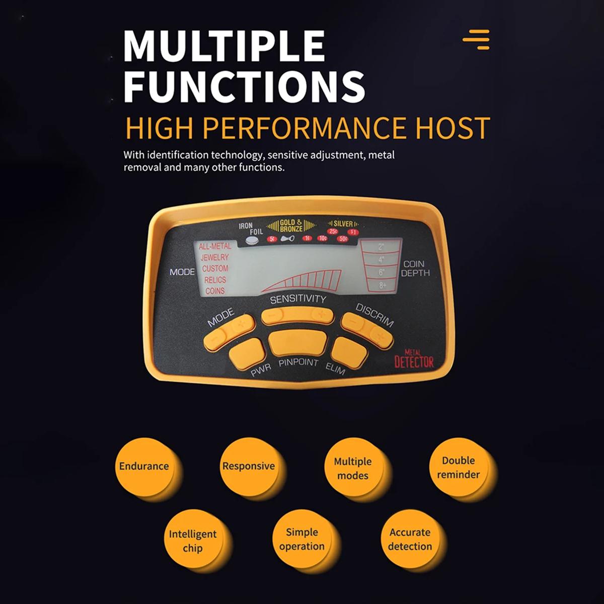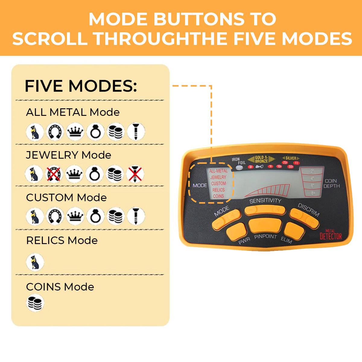 - * Pięć trybów włącz: Możesz wybrać domyślny tryb włączony lub włączony tryb włączony. Tryb biżuterii: Możesz usunąć żelazo i znaleźć małe metale, takie jak pierścionki, kolczyki, naszyjniki itp; Tryb niestandardowy: może selektywnie identyfikować poszczególne elementy i wybrać rodzaj metalu, który chcesz wybrać; Tryb dziedzictwa: Żelazo można obniżyć i tylko metale nieżelazne, poprawiając wydajność podziemnego podwyższenia metali; Tryb monet: wykorzystanie do wyszukiwania rodzajów rodzajów mon