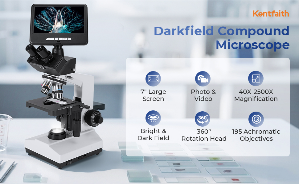 Mikroskop ciemnego pola z ekranem 7 cali, powiększenie 40X-2500X, kamera 5MP do zdjęć i filmów, 195 obiektywów achromatycznych, dwuwarstwowy stolik mechaniczny, Kentfaith