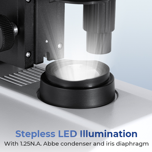 - * Regulowany Kondensor Abbego i Płynna Regulacja Światła LED: Nasz mikroskop złożony wyposażony jest w regulowany kondensor Abbego (N.A. 1.25) z przysłoną irysową, co zapewnia precyzyjną kontrolę kontrastu i rozdzielczości, dopasowaną do każdego preparatu i techniki. Wysokiej jasności dolne źródło światła LED oferuje płynną regulację natężenia, pozwalając na idealne dostosowanie intensywności.