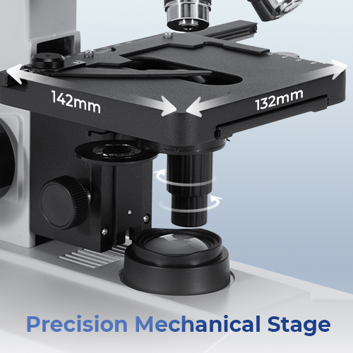 - * Precyzyjny Stół Mechaniczny & Precyzyjne Ustawienie Ostrości: Podwójna warstwa stołu o wymiarach 132×142 mm z noniuszem o precyzji 0,1 mm umożliwia płynną nawigację w osiach X-Y, dzięki czemu można łatwo zapisywać współrzędne i wracać do dowolnego interesującego punktu. System współosiowego grubego i precyzyjnego ustawienia ostrości (precyzja 0,015 mm) pozwala w ciągu kilku sekund zablokować się na docelowej płaszczyźnie, oszczędzając cenny czas podczas długotrwałych sesji